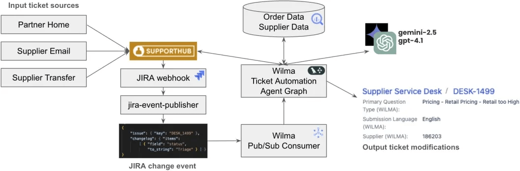 Much of the work of a supplier service specialist requires specialized skills and knowledge, but some of it is boring and repetitive work. For example, they need to manually sort work orders: review unstructured work order information, query relevant data in the database, and then enter corresponding structured data in the work order - specifically including setting the supplier ID, core issue type, and supplier's preferred language. To this end, we built a work order automation system based on LLM (as an extension of the Wilma product suite) to complete these tasks through automation to shorten response times, reduce costs, and improve the accuracy of the sorting process.