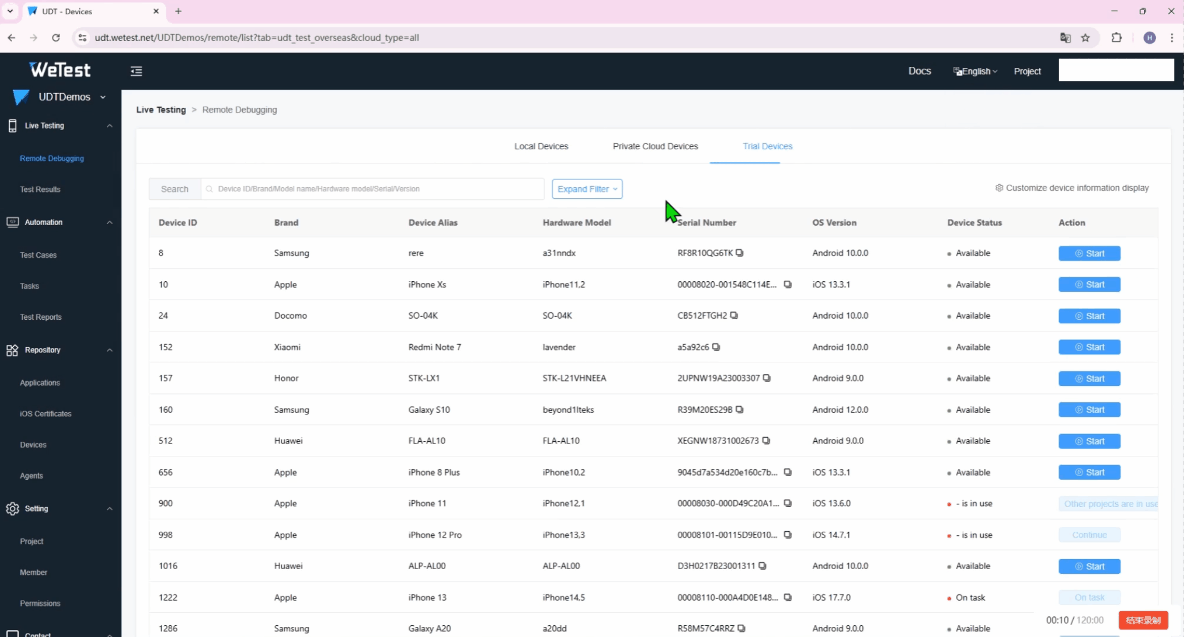 The first step is to access the platform and start a real device from the extensive cloud device lab. |