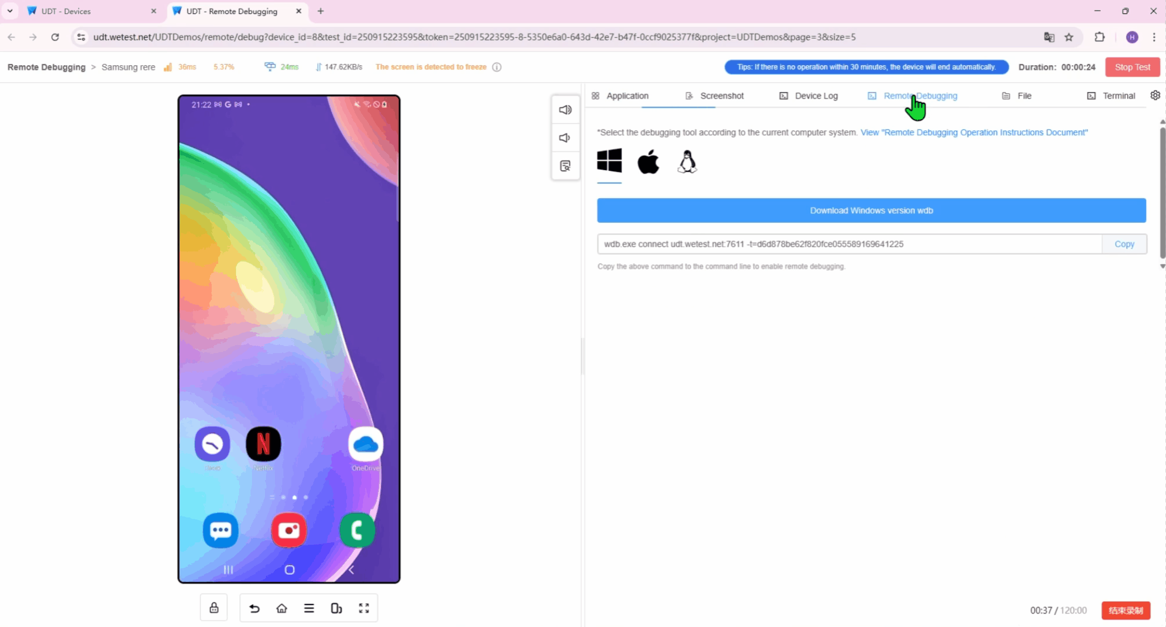 Copy the remote debugging command provided by the platform. Then, use WDB to connect locally to the cloud real device, establishing a stable bridge for control and data transfer. |