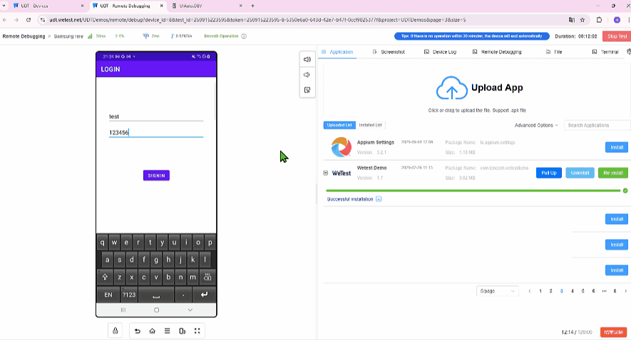 Once the device is ready, we directly upload and install the demo application (.apk file) onto the cloud device for testing. |