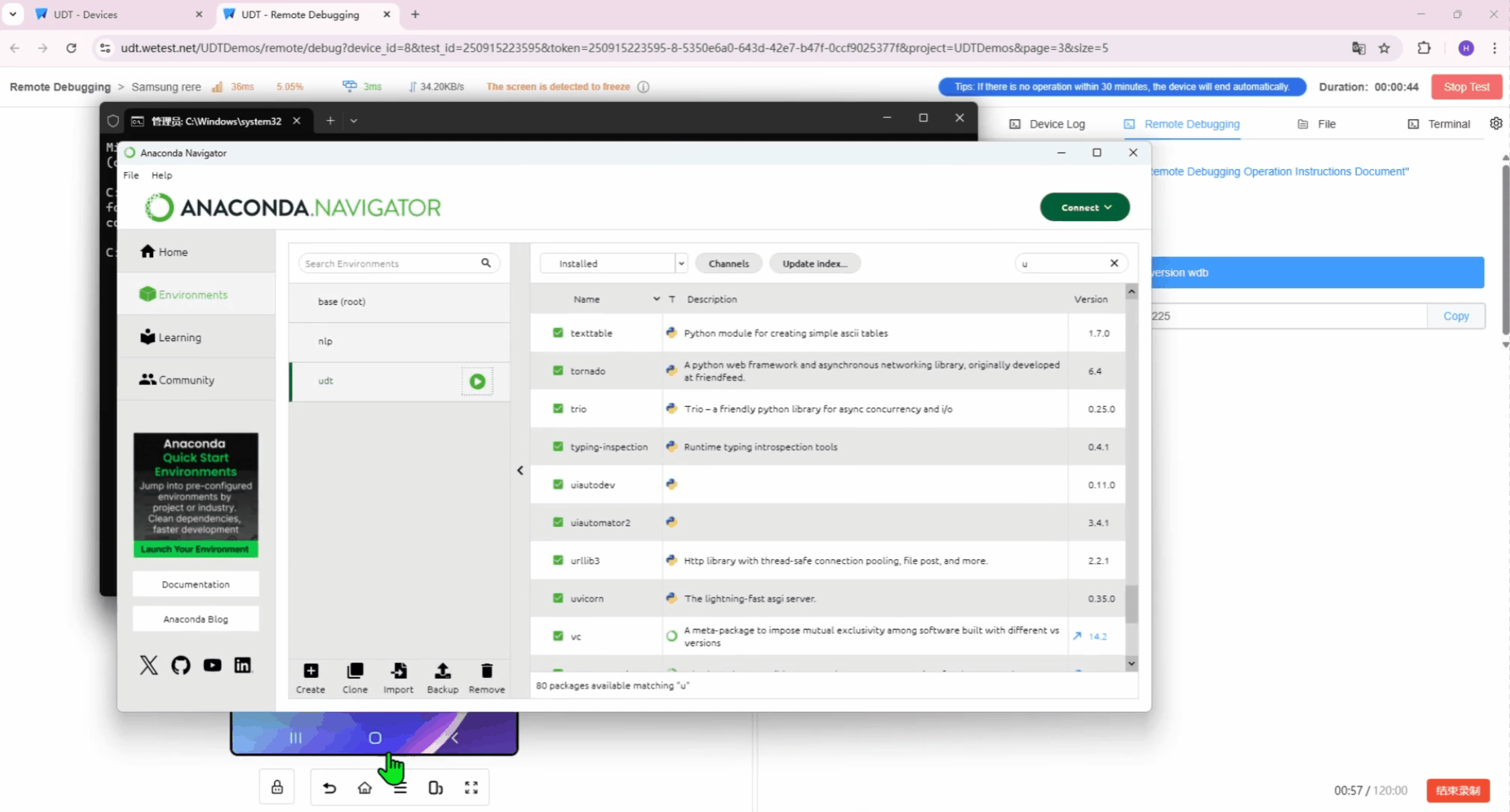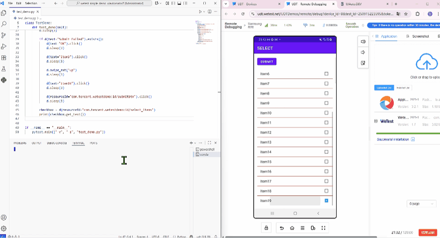 Next, we start uiauto.dev and connect to the cloud real device, providing a powerful IDE for script development. Here, we begin to write the testing script code. A key step is to use uiautomator2 to connect to the cloud real device. The UDT_DEVICE_SERIAL variable can be used to identify the device number of the UDT platform's cloud real device, ensuring our script targets the correct device. |