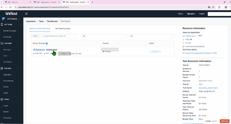 All that's left is to wait for the task to complete. Once task execution completed, we can comprehensively review device screenshots, videos, and performance data provided by the platform. |