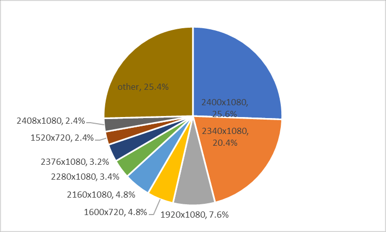 Within the FHD+ category, the 2340×1080 resolution—which ranked first last year—saw a significant drop to 24% (down from 31.4% in 2020). Conversely, the 2400×1080 resolution saw a sharp increase, rising from 8.7% last year to 25.6%.