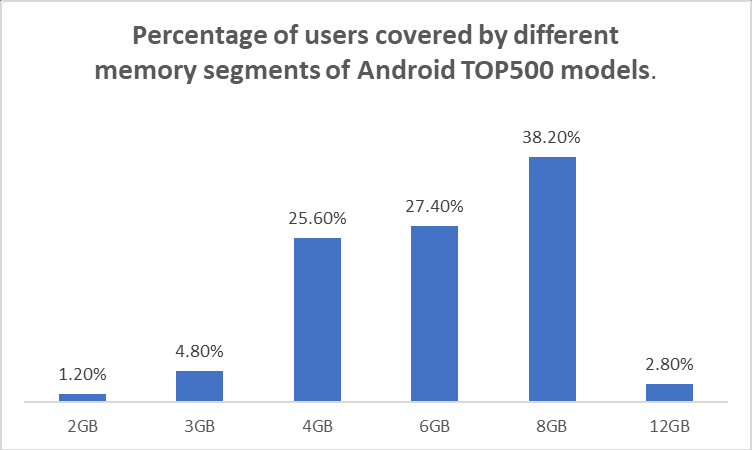 In the report's sample of the Android TOP 500 (the 500 models with the highest market share based on the WeTest adaptation index), the trend is similar: models with over 6GB of RAM have the highest user coverage at 68.4%. Specifically, 6GB models account for 27.4%, while 8GB models saw a significant increase from 19% last year to 38.2%. Among models with less than 6GB of RAM, the share of 4GB models fell to 25.6% (from 32.2% in 2020), while 3GB and 2GB models accounted for only 4.8% and 1.2%, respectively.